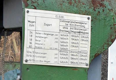 Interessant ist die an FH22 noch original vorhandene Lastentafel. Neben den Einsatzzwecken, für die diese Lok auf Friedrich-Heinrich herangezogen wurde, belegt sie auch die Verwendung von Bremswagen mit 2 bzw. 6 Magnetbremsen. |