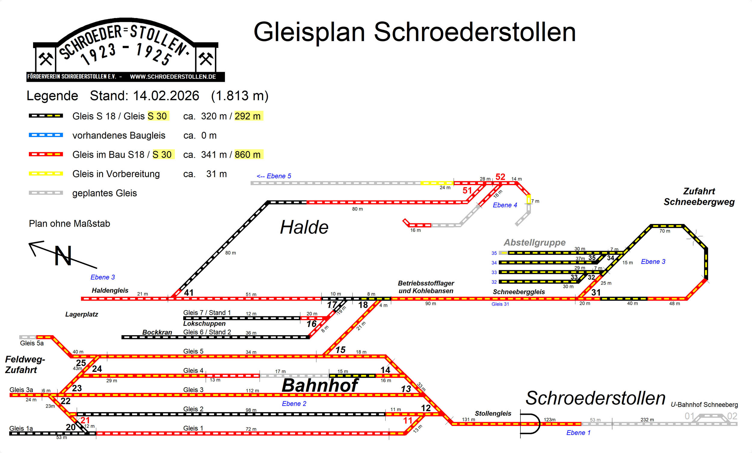 Wir betreiben keinen Bahnbetrieb im alten Sinne und benötigen daher keine 5 Aufstellgleise und keinen Lokschuppen mit Bahnstromversorgung. Daher liegen die Gleise 1 bis 5 tatsächlich an der gleichen Stelle wie ihre Urahnen, sind aber in nördlicher Richtung etwas eingekürzt. Gleis 5 ermöglicht eine direkte Fahrt vom Bahnhof zur Zufahrt Schneebergweg. Frei erfunden sind außerdem die Gleise 6 und 7 mit dem kleinen Lokschuppen sowie die Abstellgruppe mit der Wendeschleife an der Zufahrt Schneebergweg. Dort müssen wir mittelfristig Abstellraum für aufgearbeitete Lokomotiven schaffen, und diesen möglichst überdachen. Ebenso fiktiv ist der bei 400m im Stollen aufzubauende Bahnhof Schneeberg, wo in einigen Jahren Besucher die Grubenbahn zu einer Führung durch den Stollen verlassen sollen.